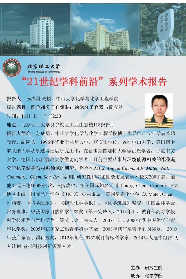 【化学学院】“21世纪学科前沿”苏成勇教授学术报告通知