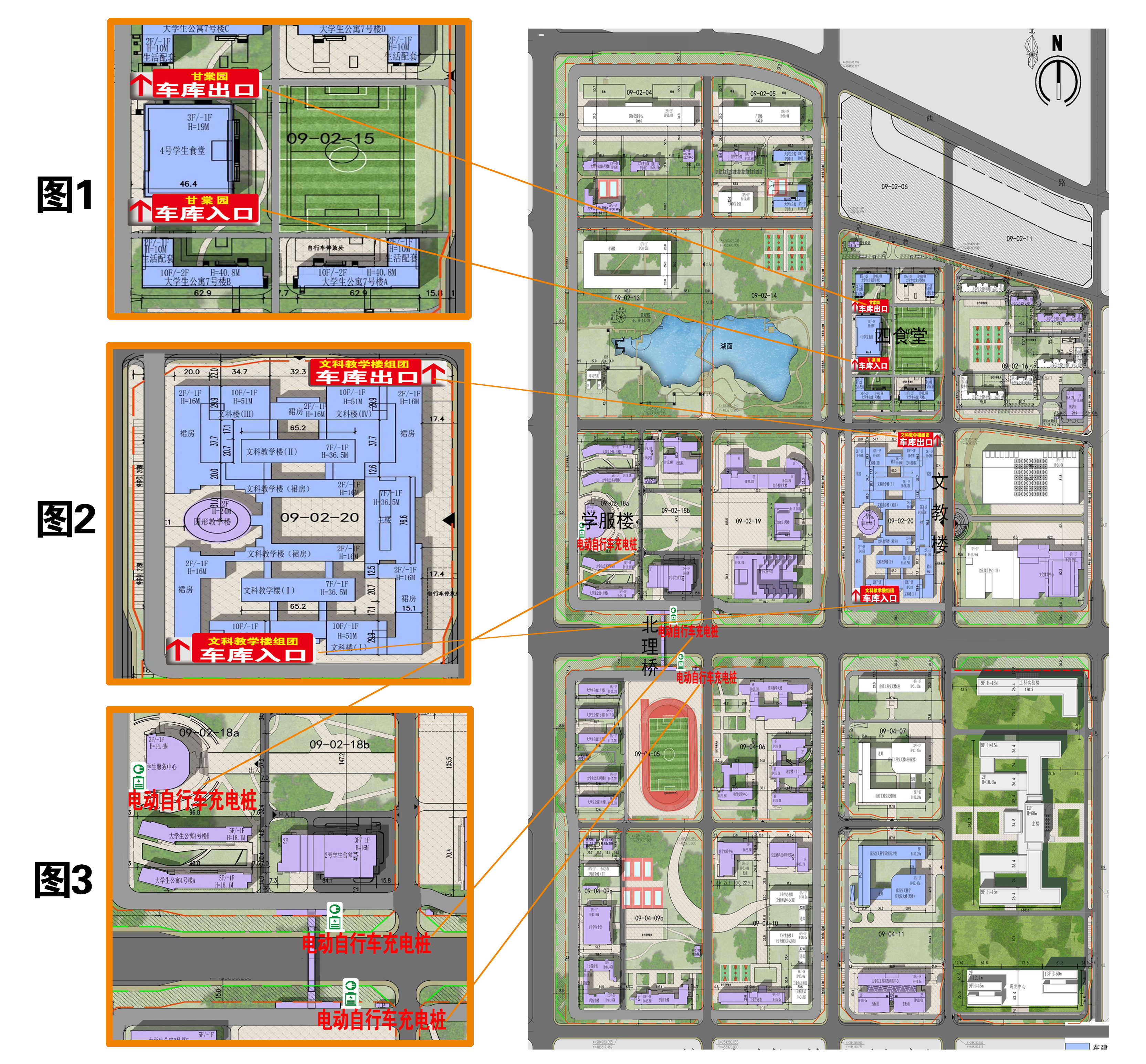 同时为有效防范安全隐患,方便师生员工出行,在校区重点区域新增了电动自行车充电桩(位置如图3所示),供广大师生员工使用。