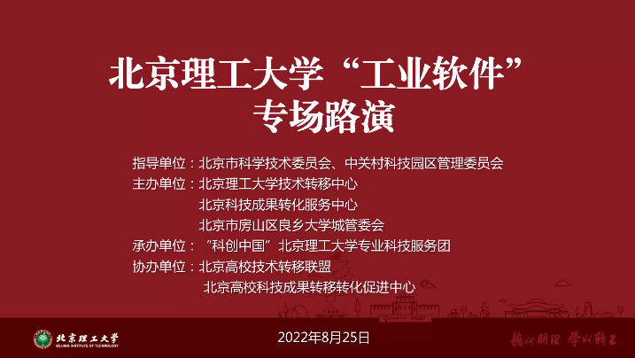 8月25日下午,北京理工大学“工业软件”专场路演活动举行。本次活动在北京市科委、中关村管委会的支持和指导下,由北理工技术转移中心、北京科技成果转化服务中心和北京市房山区良乡大学城管委会联合主办。路演采取线上线下相结合的方式,受到社会各界广泛关注。