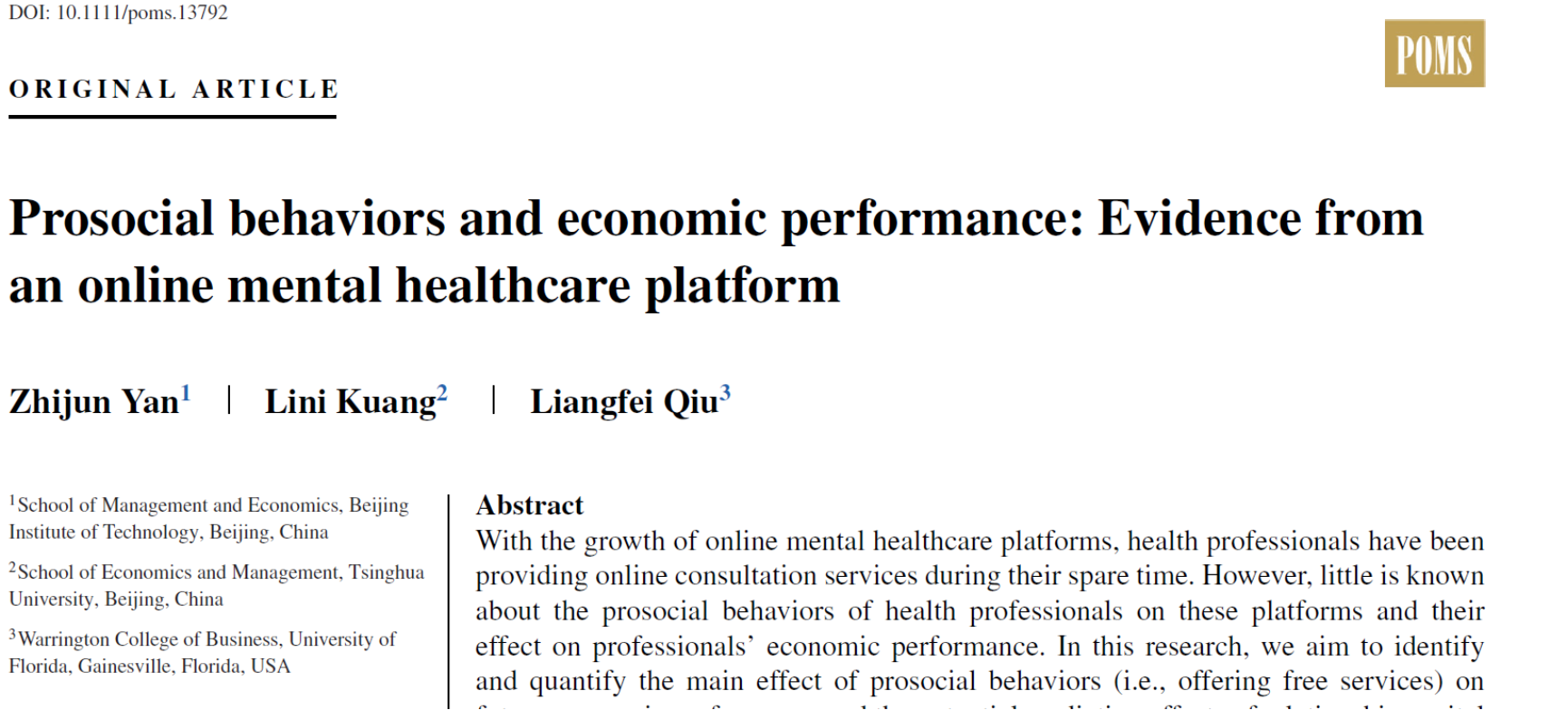 论文链接:Yan, Z., Kuang, L., & Qiu, L. (2022). Prosocial behaviors and economic performance: Evidence from an online mental healthcare platform. Production and Operations Management, 31, 3859– 3876. https://doi.org/10.1111/poms.13792