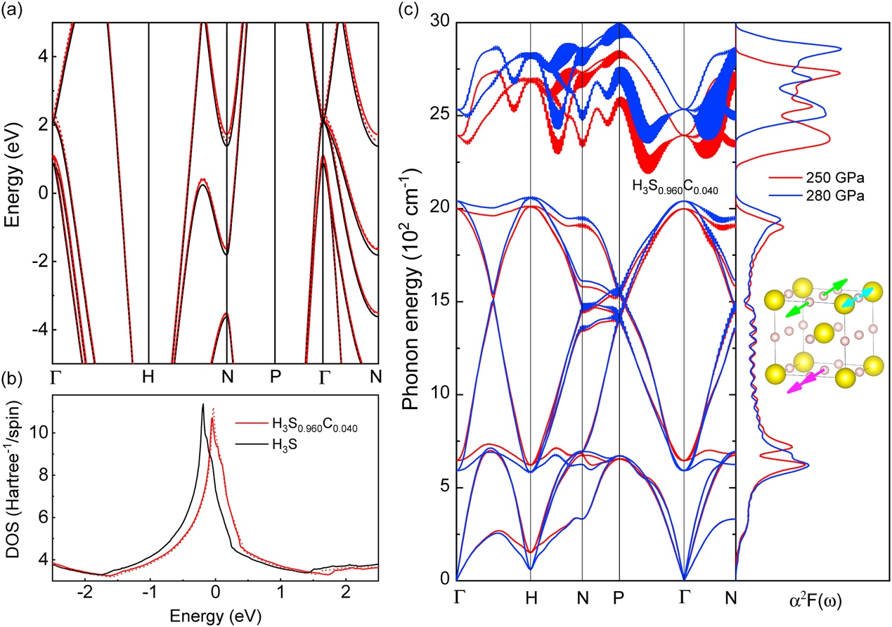图1 (a)(b) Im-3m相H3S的能带结构和DOS:H3S@220GPa (黑线),H3S0.960C0.040@220GPa (红色实线),H3S0.960C0.040@240GPa (红色虚线)。(c)声子色散谱和Eliashberg谱函数:H3S0.960C0.040@250GPa (红线),H3S0.960C0.040@280GPa (蓝线)。