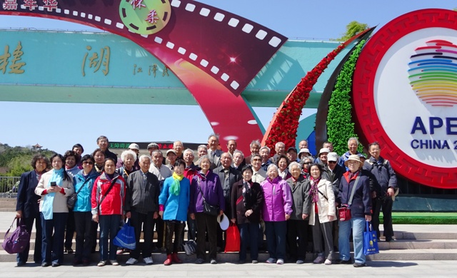 雁栖湖,三面环山,景色宜人,翠竹常绿,草木清新,繁花似锦,碧水蓝天,赏心悦目。老同志们登望湖亭,环湖而行,微风拂面,畅谈养生休闲健康,共叙过去的好时光,相互鼓励,笑迎未来,其乐融融。九位老校友应邀参加活动,与当年的老师和同学一同回忆好时光。正值第五届国际电影节开幕之际,各种造型给公园增添了靓丽的景致,门前大型的汽车侠的模型,给公园增加了吸引力。